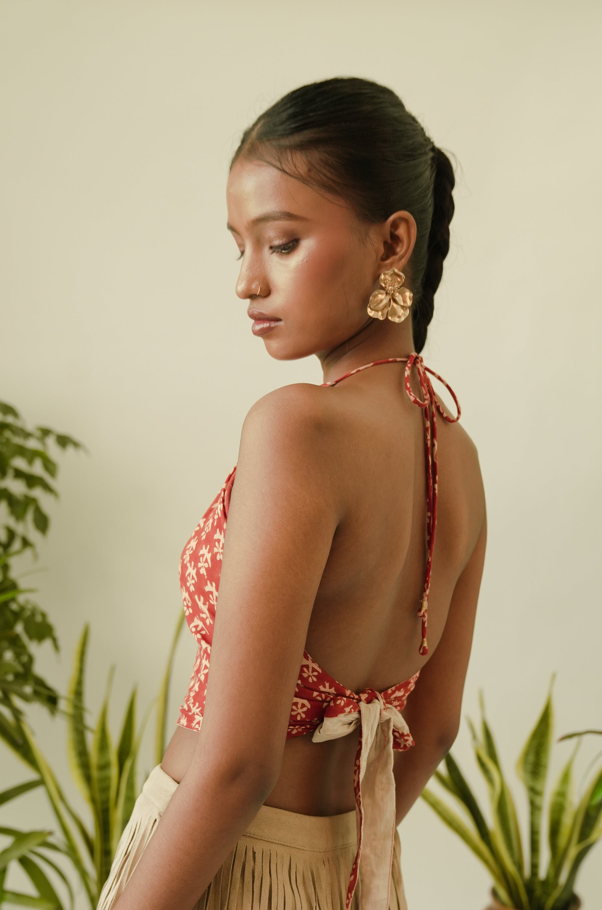 Crafted with traditional Bagru handblock printing, this backless top is a bold yet elegant expression of slow craft — subtle variations in print are a mark of its handmade beauty.